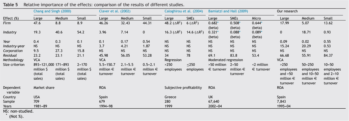 In summary, all the studies reviewed and ours are aligned in the identification of the importance of the firm effect in the case of large companies. So we can accept it, even though the mean size of the large Spanish and other European countries firms is markedly less than that of the US firms. However, this coincidence is not observed in the case of small and medium firms. The inconsistent results of the previous studies may be due not only to the different criteria followed to divide the samples by size, but also to the fact of grouping into a single category small and medium-sized firms, as Caloghirou et al. (2004) and Bamiatzi and Hall (2009) do. When the focus is strictly on the medium-sized organizations, as we and Chang and Singh (2000) have done, it is observed that the industry effect is the one that prevails. While in the case of small firms, and at least in Spain, it is the firm effect that seems to have some importance. Issues that are undoubtedly due to the peculiar characteristics of each group of organizations.