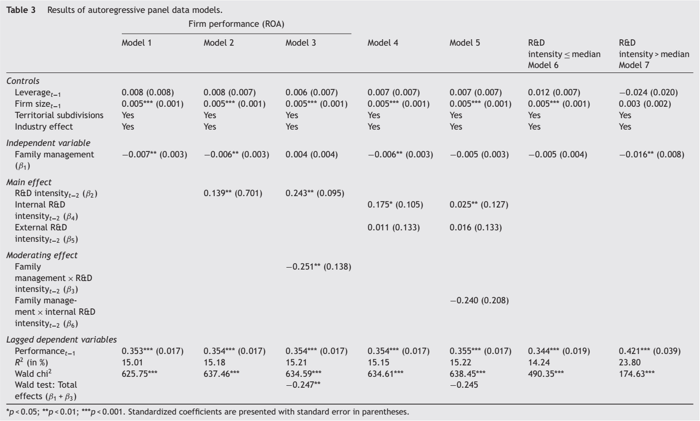 In order to measure the moderating role of R&D intensity on the relationship between family management and firm performance, a step-wise manner is followed as reported in Table 3 and is explained in the following lines.
