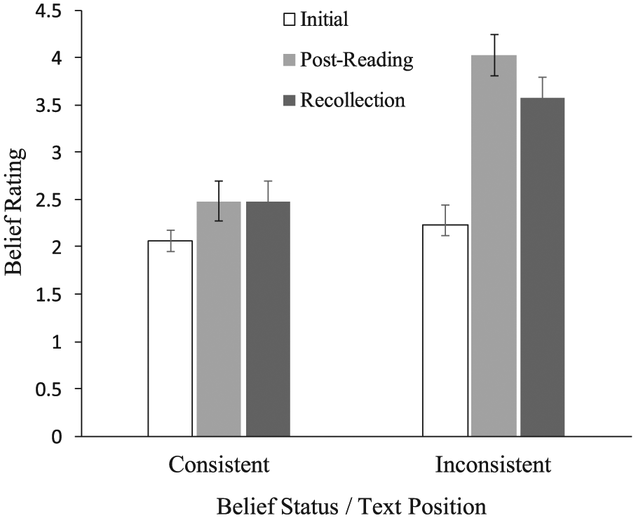 Recollection of initial beliefs are also shown in Figure 1. To assess if there were systematic differences in recollection accuracy as a function of text belief consistency, a mixed-effects ANOVA was conducted with initial beliefs and recollection of initial beliefs as the within subject variable, and text belief consistency as the between subject variable. Consistent with our hypothesis, this analysis revealed that recollections of initial beliefs were more moderate (