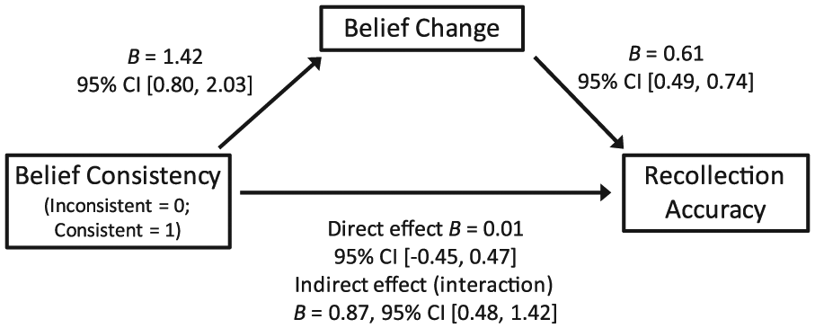 Process modeling (Hayes, 2013) was used to test whether the relationship between belief consistency of the text read and recollection accuracy was mediated by belief change (see Figure 2). Model 4 (Hayes, 2013) was used with 1000 bootstrap samples. This model accounted for a significant amount of the variance,