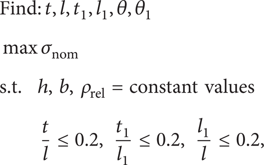where ρrel = 4(t/l)(1/sin2θ) + 4(t1/l)(sinθ1/sin2θ1sin2θ) is the nondimensional relative density, σnom is the nondimensional failure strength, σnom = Pcr/A, Pcr is the critical load, and A is the compression area. In the optimization problems, the nondimensional ratios t/l, t1/l1, and l1/l are within the given range, and we take θ = θ1 = 45° as the optimal value from a practical perspective, suggested by Kooistra et al. [11], and εY = 0.002.