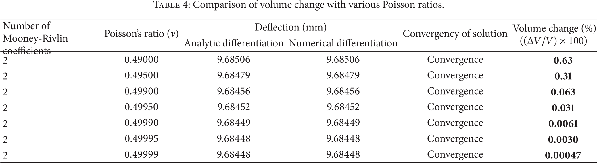 Hyperelastic rubbers are widely used in industry as sealants, load-bearing parts, and damping parts and in other similar applications. However, the incompressibility and nonlinearity of rubber cause many difficulties, one of which is divergence problem, in analytic and numerical studies like the finite element method [1–7] as noted in the literature [7]. Furthermore, the problems of self-buckling, follower forces, and contact conditions cause additional difficulties in analyzing rubber. Accordingly, this paper attempts to contribute to solving these problems by proposing a rubber analysis procedure using a numerical differentiation method and Poisson iteration method.
