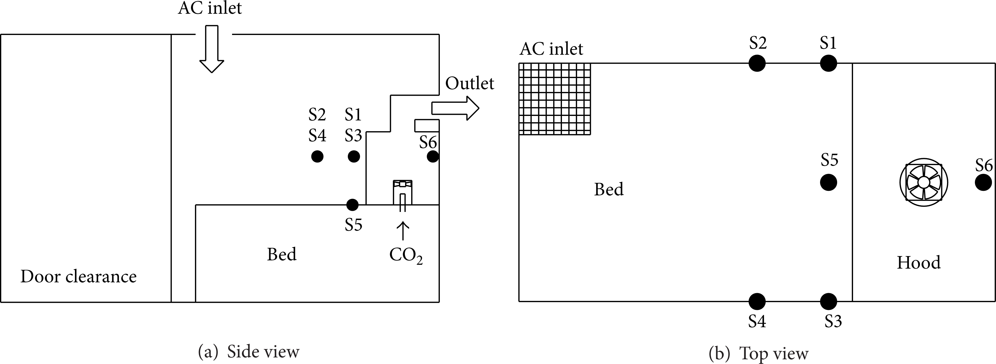 Figure 2 is the schematic diagram of experimental measurement of CO2 as tracing gas; S1∼S6 are the locations of CO2 sensors. The CO2 is discharged from a cylinder, and it reaches the hood bottom through a pipe and enters a columnar container upward. A fan at the top of the container sucks air in the hood and mixes with CO2 and blows the mixture (CO2 concentration is fixed at 7000 ppm) into the hood. The volume flow rate delivered by a DC fan is controlled at 0.236 m3/min ± 2% (average air velocity 2 m/s) to simulate the patient coughing out GWB continuously. Flow rate of the fan is measured by a wind tunnel constructed according to AMCA210-99. One of the six CO2 sensors is in the hood and is located on the rear end of hood, and the other five are outside the hood catching leaked CO2. There is a heater at the exit end of the fan to keep the blown gas temperature at about 38.5 ± 0.5°C. The experimental hood is shown in Figure 2, 0.6 m long and 0.6 m high. The inlet flow rate of conditioning air is measured by ALNOR Balometer capture hood EBT721 with accuracy ± 0.2 m3/min. The CO2 was sensing by Sensecube CO2 controller KCD-DA with accuracy ± 3% of reading. The total uncertainty of this experiment is about 8.4%. The experimental measurement was repeated three times and results shown in Figure 3 were their average.