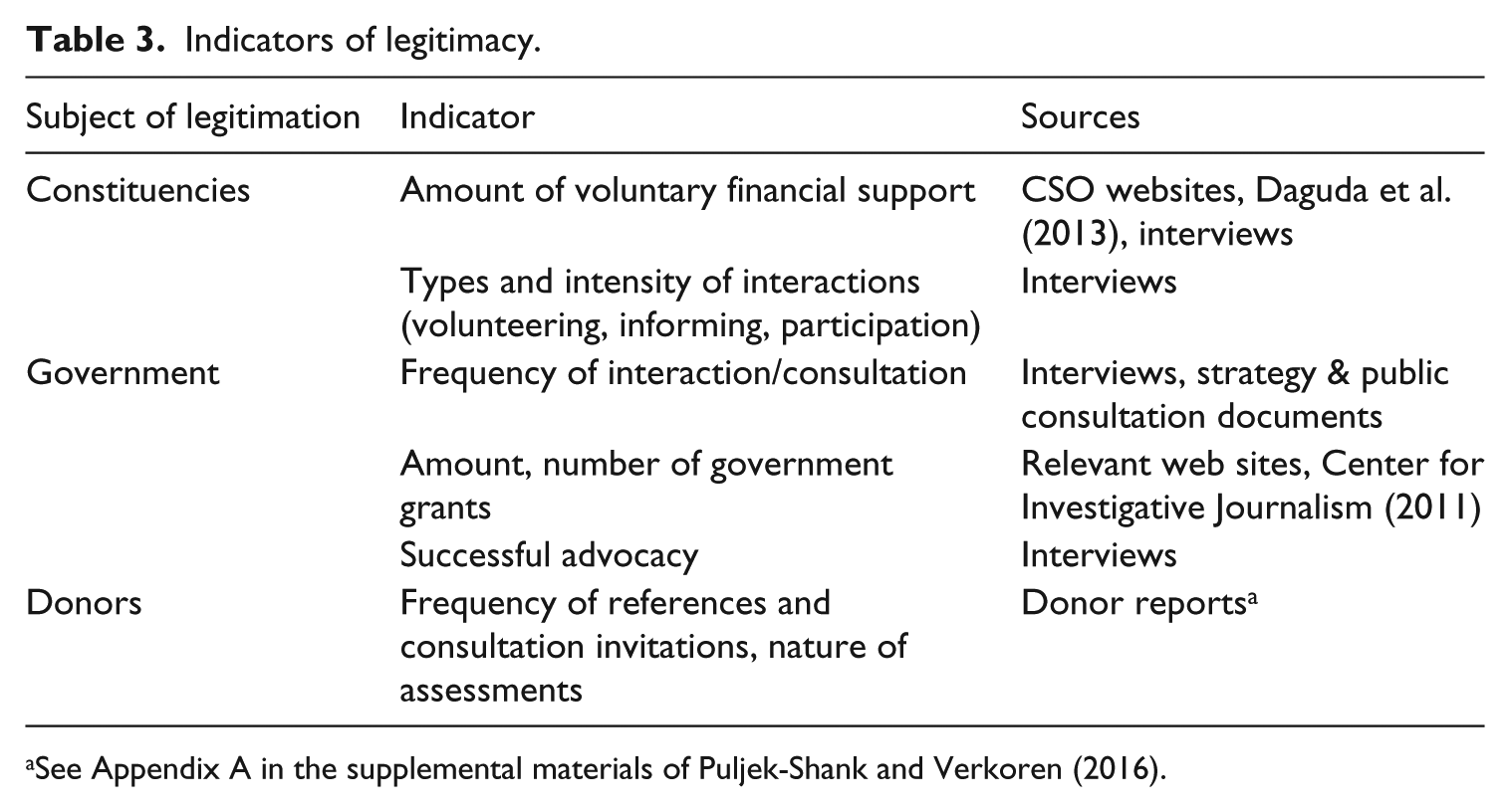 Table 1 summarizes sources of legitimacy mentioned often in the literature on legitimacy and CSOs.