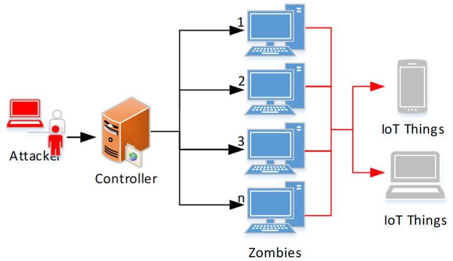 DoS attacks are being made to disrupt the services of IoT platforms. In detail, the communication network between IoT objects is blocked resulting in being non-communicating. The use of IoT in many areas, heterogeneous structure, resource constraints and the multitude of objects in the network make it difficult to get protected from DoS attacks. The security of IoT objects’ communication can be ensured by end-to-end or point-to-point encryption techniques. 50 However, IoT has a weakness against attacks that disrupt its functioning, occupy resources and consume the energy of devices. The most important type of attack affected by such weaknesses is the DoS attacks. Likewise, DoS attacks can target all of the physical, data link, network, transmission and application layers of TCP/IP. Moreover, any weakness in TCP/IP—the main Internet Protocol (IP)—also threatens IoT. As shown in Figure 10, the attacker gets control of the target system by sending a continuous data request to the target IoT platform from different locations using the computers he has converted to “zombie.”51,52 DoS targets the accessibility of IoT systems.