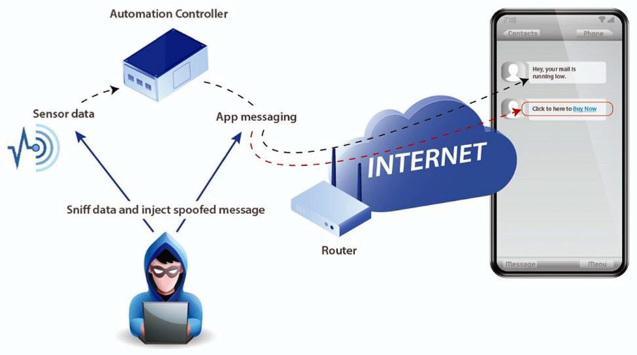 Cyber events in cyber environments such as computers will now be seen in physical environments such as an automobile’s control panel, intelligent heating systems or medical systems. Attackers do not need to have direct access to attack physical cyber systems, rather they can access the distributed structures of the system instead of direct access and manipulate the entire industrial infrastructure. This manipulation is achieved by seizing the sensor nodes, where the objects are connected to each other via the broadband router in an unencrypted fashion. Figure 14 shows a manipulation on a smart IoT system using the deception method.