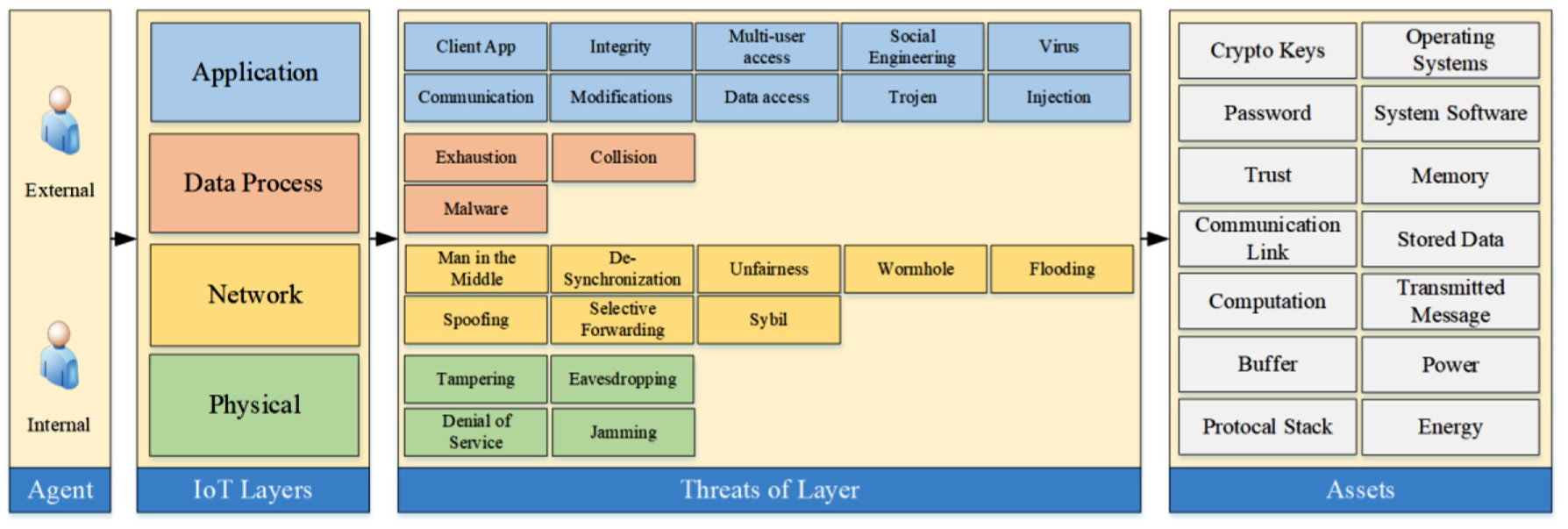 As shown in Figure 8, internal and external attacks threaten the layers of IoT such as physical, network, data and application. The details of the suggested layered threat approach presented in Figure 8 are described in the following subsections.