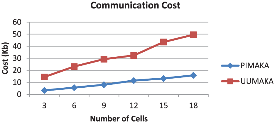 Figures 6 and 7 show the computational and communication costs involved in PIMAKA and UUMAKA schemes, respectively. As depicted by the figure, the computational and communication cost of both the schemes increase when the number of cells is increased. Since PIMAKA does not involve the heavy computations of bilinear pairings, it has 72% lesser computational cost and 71% lesser communication cost, than the UUMAKA scheme.