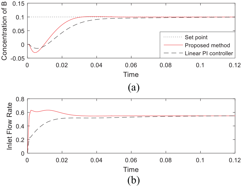 In Figures 11 and 12, the control performance of the linear PI controller and the nonlinear PI controller is given. According to Figures 11 and 12, it is noticeable that the traditional linear PI controller is unable to achieve good control effectiveness with regard to nonlinear Hammerstein–Wiener model. In particular, it results in a sluggish response when the value of the set point is 0.1. Nevertheless, an oscillatory response is discovered when the value of the set point is −0.5. By comparison, the designed nonlinear PI controller in this paper can effectively balance the sluggish and oscillatory response for positive and negative set points. As a result, the nonlinear PI controller can derive good tracking performance under the nominal operating condition.
