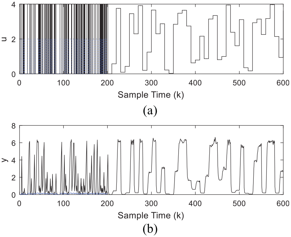 Two sets of binary signals with different sizes are 200 binary signals with 0 or 4 and 200 binary signals with 0 or 2, and 400 random signals between [0, 4] are employed to learn the Hammerstein–Wiener model parameters. Figure 5 shows the inputs and outputs of the Hammerstein–Wiener model.