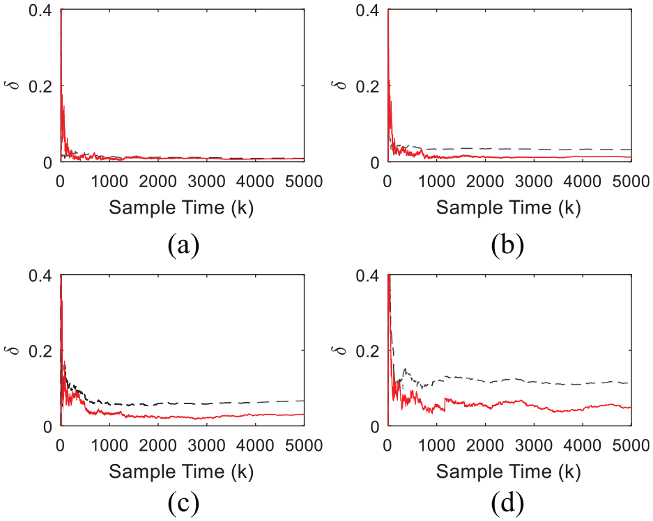 From Table 1 and Figure 7, the proposed correlation analysis algorithm can obtain more accurate parameter estimation of dynamic linear block than the RLS algorithm 41 for uncertainty process disturbance. With the increase in noise-to-signal ratio, the proposed learning algorithm has more obvious advantages.
