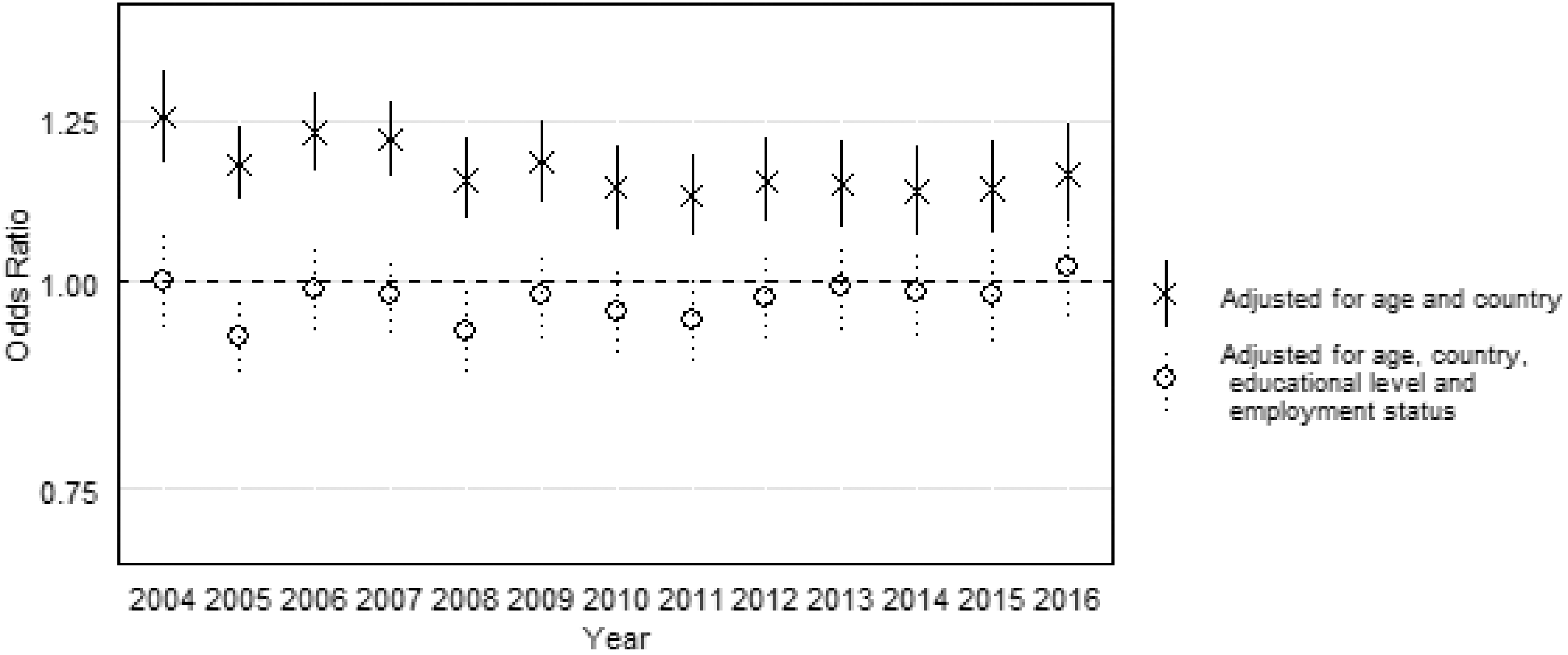 Figure 2 shows the yearly women’s OR (versus men) obtained by the