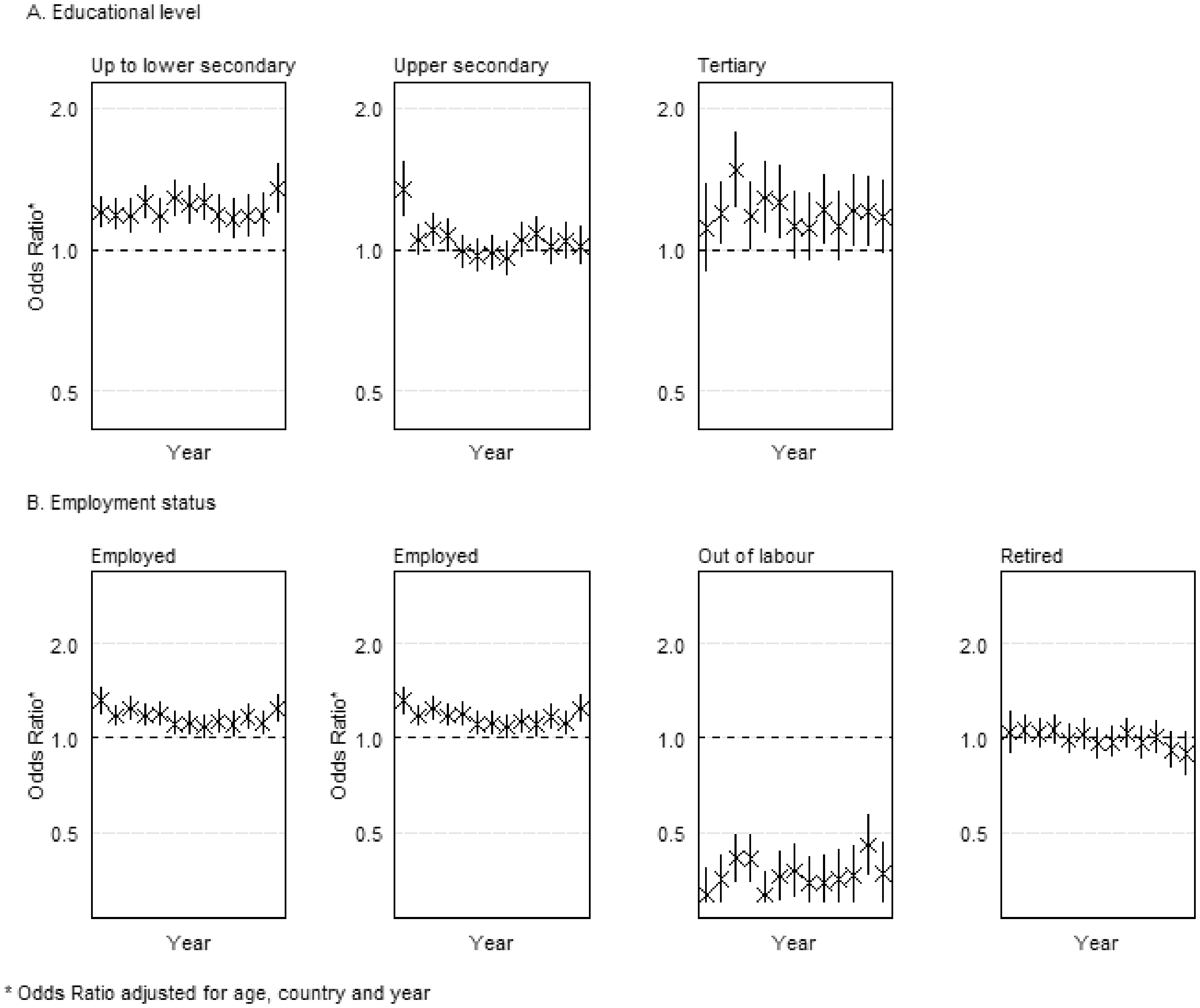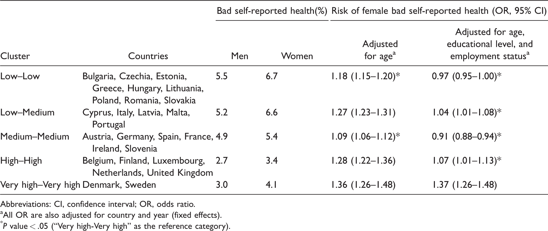 We performed logistic regression models to model bad health as function of gender, first adjusting for age, year, and country, and then also for educational level and employment status.