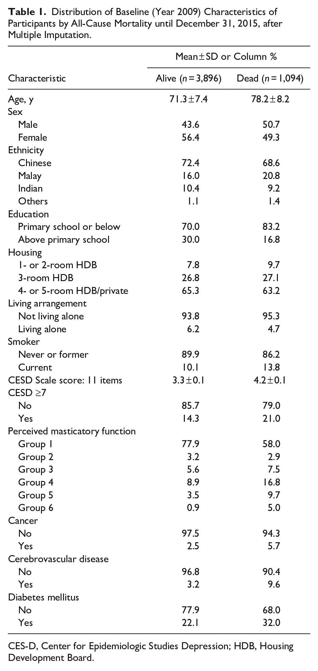 Distribution of Baseline (Year 2009) Characteristics of Participants by All-Cause Mortality until December 31, 2015, after Multiple Imputation.