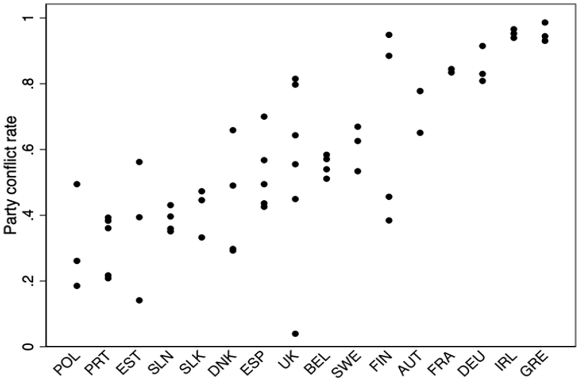 We analyse the degree of conflict in government–opposition relations by looking at parliamentary voting, as did several studies before us (e.g. De Giorgi and Marangoni, 2015; Hix and Noury, 2016; Louwerse et al., 2017). We repeat and build on Tuttnauer’s (2018) analysis, which in turn builds on a dataset by Coman (2015), of opposition parties’ conflict vis-à-vis the government in legislative votes, 6 using a similar cross-sectional dataset. However, we exclude from the data Switzerland (which is not parliamentary) and Latvia (for which data on no-confidence was missing) and instead include Portugal (De Giorgi and Dias, 2019) and Spain. Our dataset thus consists of 59 opposition parties in 16 European countries: Austria, Belgium, Denmark, Estonia, Finland, France, Germany, Greece, Ireland, Poland, Portugal, Slovakia, Slovenia, Spain, Sweden and the United Kingdom.