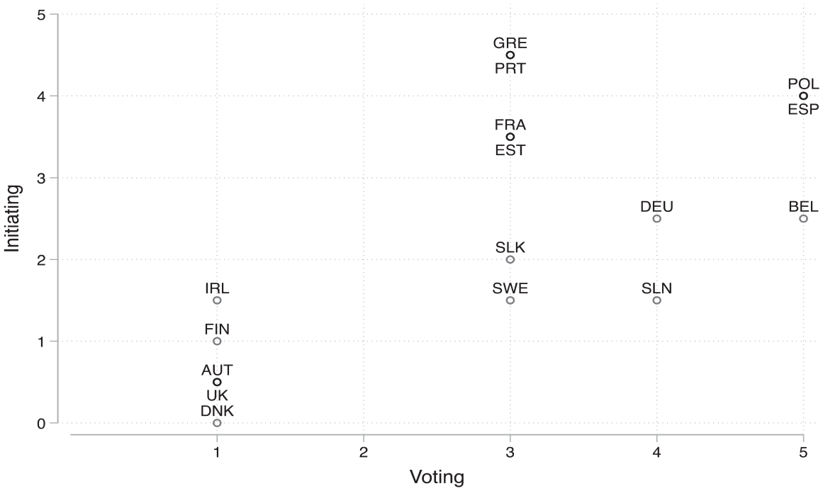 Since the country scores for the initiating and voting stages are correlated, including both in the regression models may have introduced multicollinearity to a degree that can shed doubt on our results (VIF values of 4.62 and 6.62 for initiating and voting, respectively). We therefore ran the same models using orthogonalised versions of the two variables, which enables us to eliminate any multicollinearity between the two-stage variables and reducing their VIF values substantially (2.37 and 2.17, respectively). The results hold (see Table A5 of the Supplementary Information).