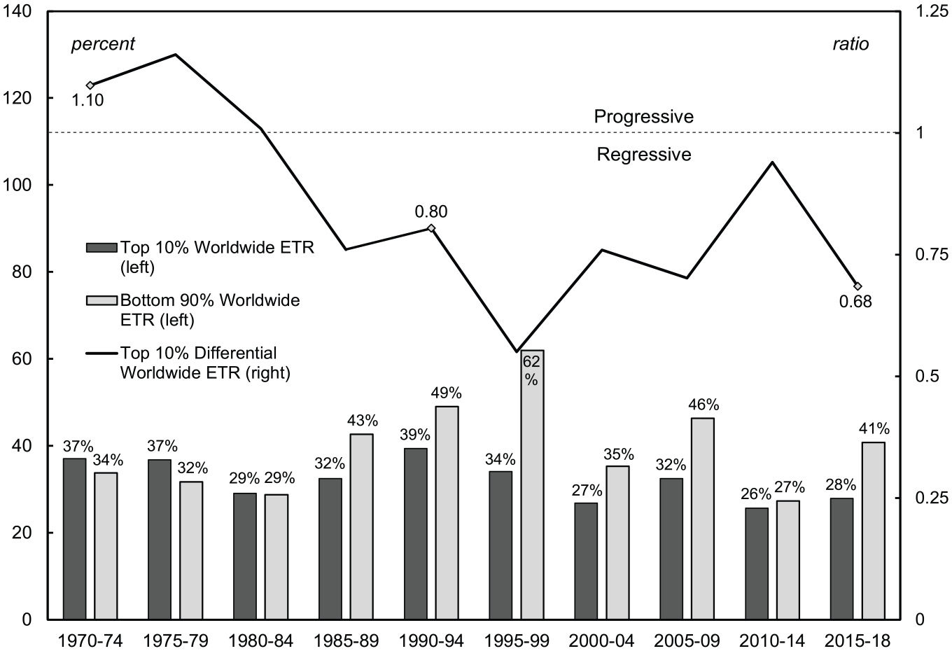 With some of the main methodological issues outlined, we now turn to our main findings. Figure 3 shows the worldwide ETR (federal, state, and foreign income taxes as a percentage of pretax domestic and foreign income) for US nonfinancial corporations in Compustat disaggregated by size. In the bottom part of the figure, we find bars with the ETRs. The dark grey bars plot the worldwide ETR for the top 10 percent in Compustat, and the light grey bars plot the worldwide ETR for the bottom 90 percent. The line above the bars allows for an easier comparison of the worldwide ETRs of the top 10 percent and the bottom 90 percent, expressing them as a ratio. The ratio can be interpreted as a measure of the progressivity of the domestic and foreign tax structures. 56 A ratio of one indicates a proportional tax regime (i.e., large corporations are subject to the same ETR as smaller corporations), a ratio above one indicates a progressive tax regime (i.e., large corporations are subject to a higher ETR than smaller corporations), a ratio below one indicates a regressive tax regime (i.e., large corporations are subject to a lower ETR than smaller corporations).