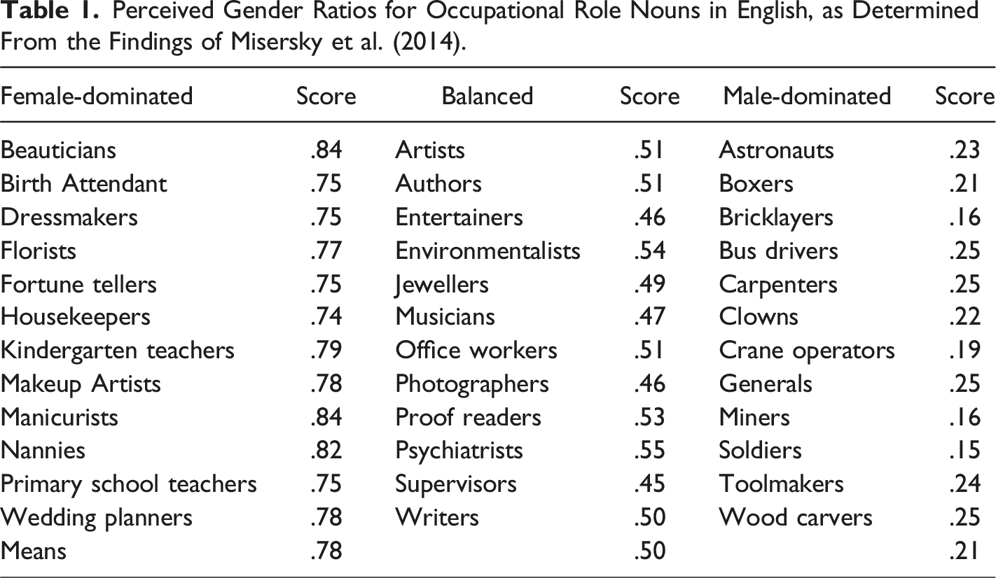 Perceived Gender Ratios for Occupational Role Nouns in English, as Determined From the Findings of Misersky et al. (2014).