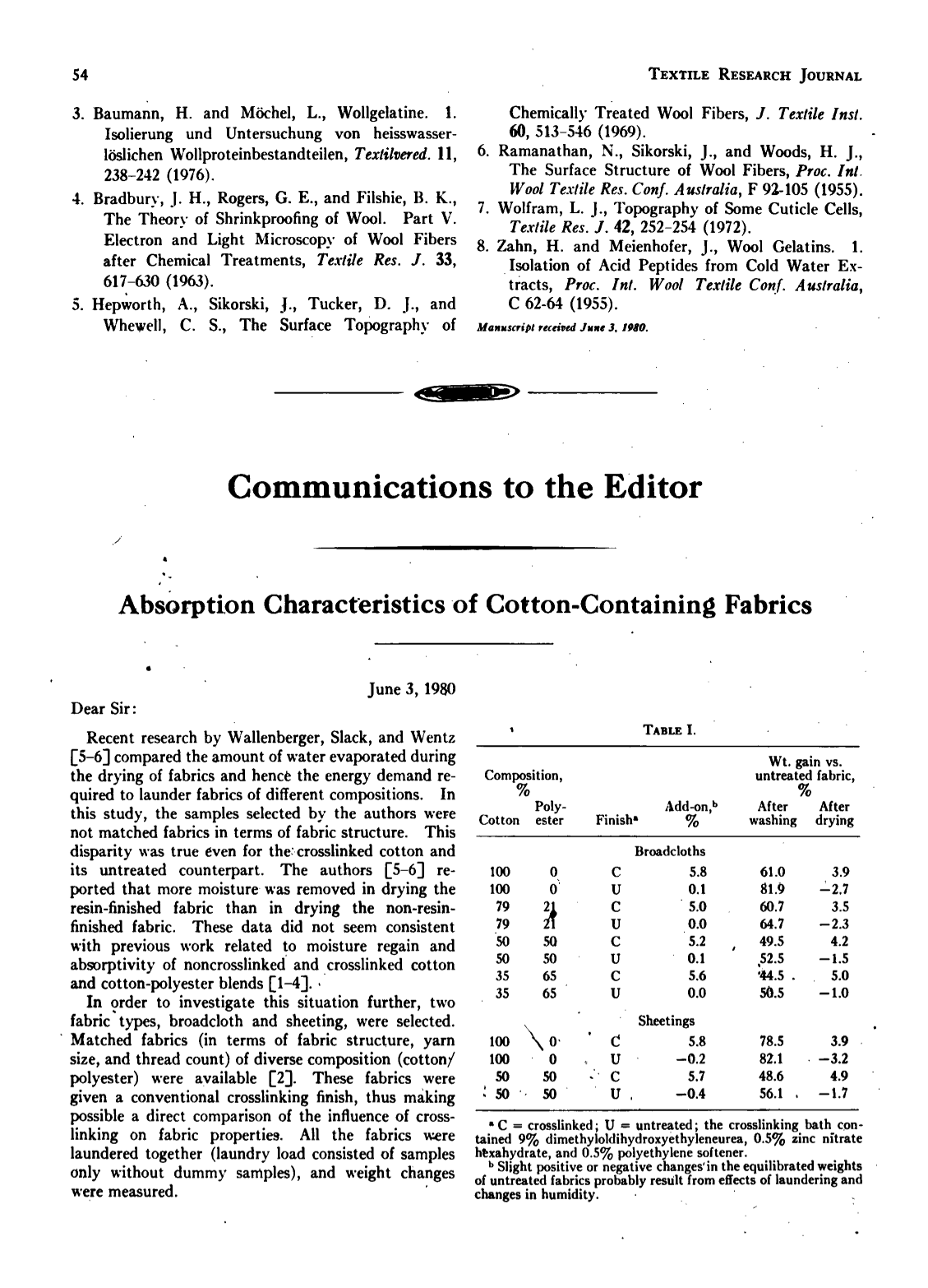 Harper, R.J. , Jr., Bruno, J.S., Blanchard, E.J., and Gautreaux , G.A., Moisture-Related Properties of Cotton-Polyester Blend Fabrics, Tcxtilc Res J.46, 82-90 (1976).