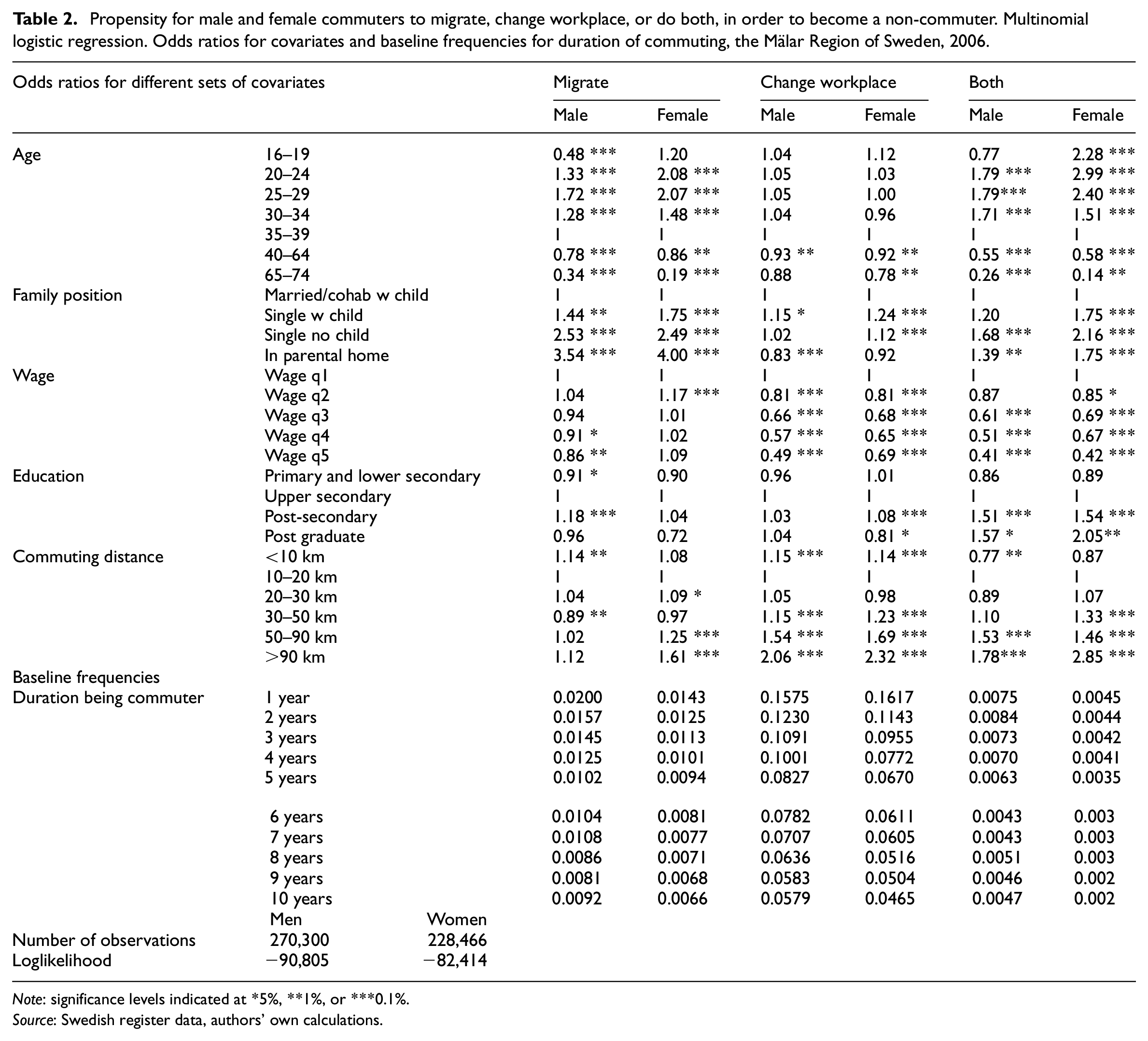 Propensity for male and female commuters to migrate, change workplace, or do both, in order to become a non-commuter. Multinomial logistic regression. Odds ratios for covariates and baseline frequencies for duration of commuting, the Mälar Region of Sweden, 2006.