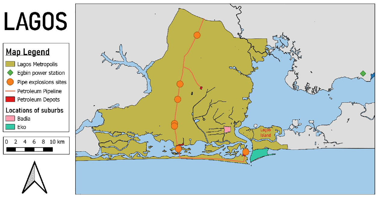 It is therefore unsurprising that these hydrocarbon pipes beneath Lagos have been a source and object of urban conflict. The pipelines have been the target of theft, sabotage and vandalism. Oil bunkering – the act of drilling into the pipelines with the intent to steal for auto-consumption or to sell – is a common occurrence and costs the government billions of dollars per year (Olu-Adeyemi, 2020). Oil bunkering compromises the integrity of pipes, often resulting in pipeline explosion disasters causing mass casualties in the areas where the infrastructure is located. While these have been most prominent in the oil producing Niger Delta region, they have also occurred in Lagos, including explosions in 2000, 2006 and 2007 that resulted in many people being injured and a high number of casualties (Olu-Adeyemi, 2020; see Figure 1), as well as widespread environmental impacts (Omodanisi et al., 2015). Oil pipe vandalism is not the only cause of these events, in 2020 more than 20 people were killed in an explosion caused by an exposed oil pipe being hit by a heavy truck. The pipe had been exposed on the road’s surface due to erosion by Lagos’ intermittent floods and soil subsistence and erosion (Olawoyin, 2020). Given the pipeline infrastructure geographical distribution, Lagos pipeline explosions have tended to occur in areas largely populated by poorer socio-economic groups within the city or in peri-urban fringe communities. Poverty and vulnerability to pipeline explosions in Lagos are thus closely linked as the poorest live in the highest risk areas, where the pipelines traverse underground (Onuoha, 2009; see Figure 1).