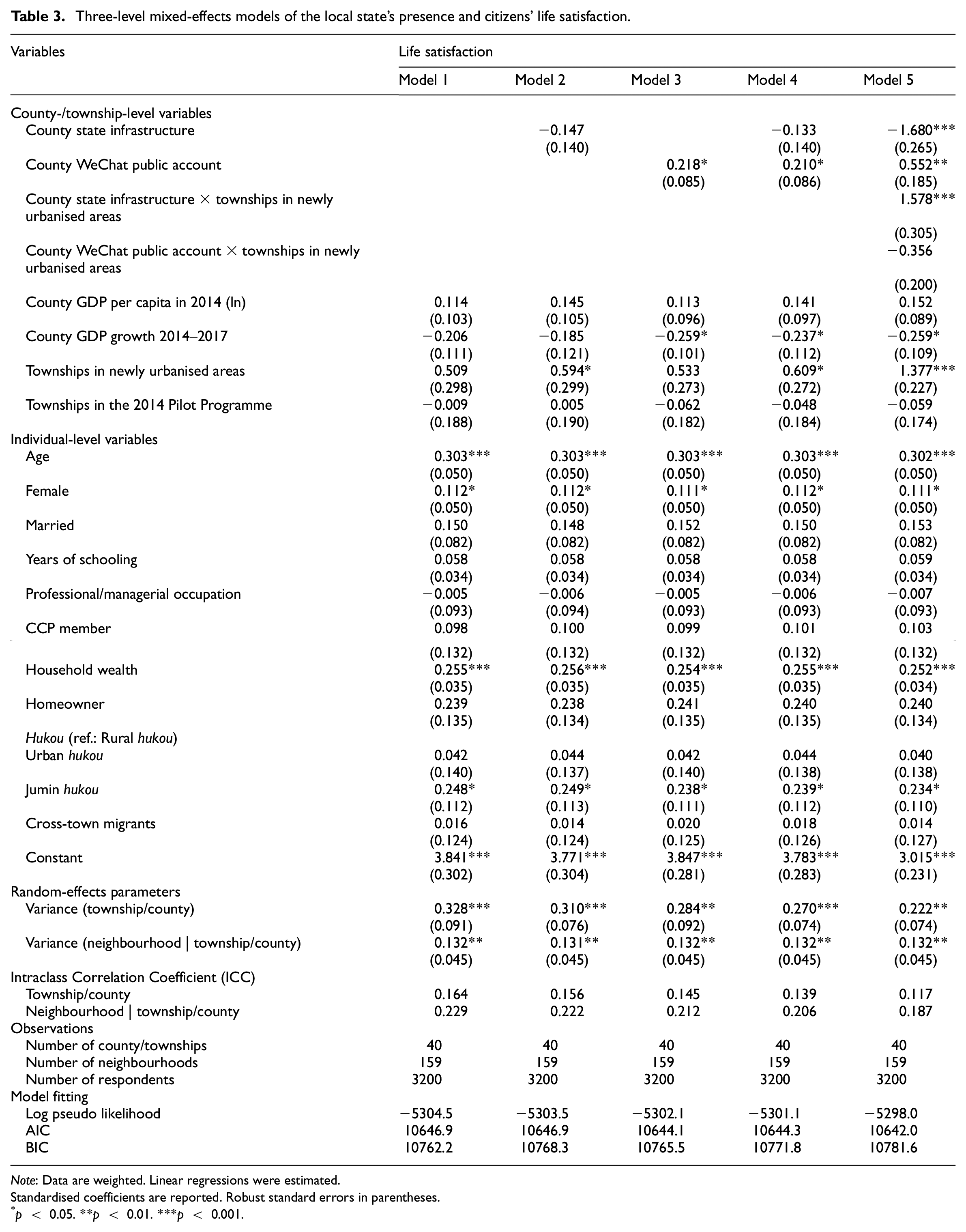 We merged the measures of the local state’s physical and virtual presence with the relevant data from the 2018 Urbanisation and Quality of Life Survey. The dependent variable was respondents’ self-reported life satisfaction. To better illustrate the results, we employed three-level mixed-effects linear regressions to estimate the basic models, treating life satisfaction as a continuous measure. Individual-level covariates and controls of local economic development and sampling design effects were included in the baseline model. We then added the measures of the local state’s physical and virtual presence, first separately and then together. To determine whether the relationship between the local state’s presence and citizens’ life satisfaction differed between newly urbanised areas and potential sites of urbanisation, we included the interactions of the two variables measuring the physical and virtual presence of the local state with the townships in newly urbanised areas versus in potential sites of urbanisation.