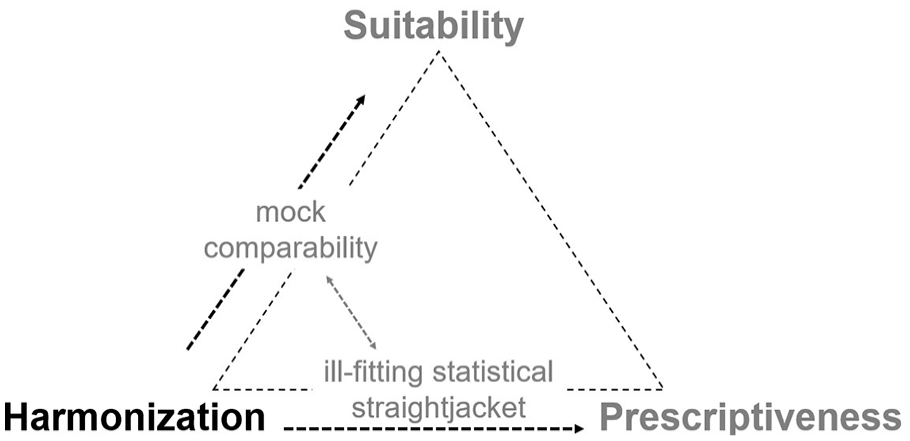 We contend that there are substantial trade-offs between suitability, prescriptiveness, and harmonization. When two are maximized, the third will suffer. Statistics that are both prescriptive and widely suitable cannot be globally harmonized, because prescriptive measurement guidelines will be tailored to domestic, local, or regional contexts. We label the resulting condition
