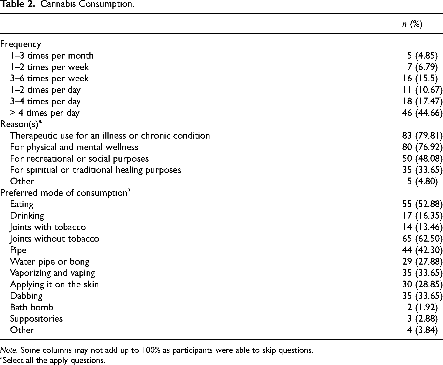 Table 2 summarizes the information collected about respondents’ cannabis consumption including frequency, reason(s), preferred modes of consumption, and amount used. Frequency was reported according to monthly, weekly, and daily consumption. 73% (