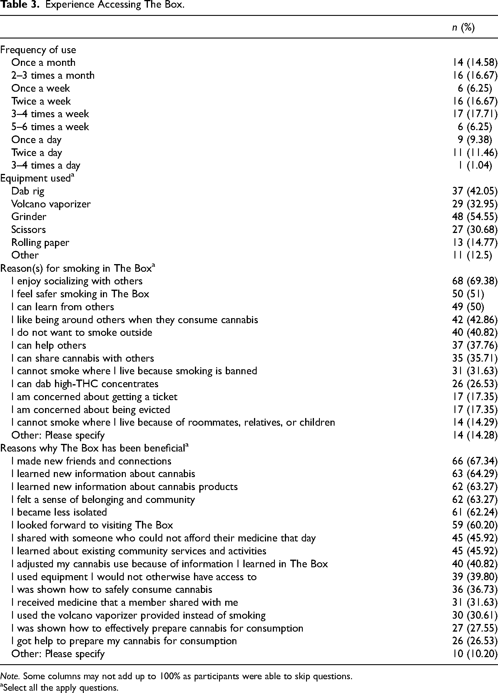 We asked respondents how often they accessed The Box before its temporary closure, what equipment they used (if any), how much they smoked during a regular visit, why they smoked in The Box, and how beneficial the space had been to them (see Table 3). In terms of frequency of visits, the sample was split into three groups: (a) monthly visitors (31%,