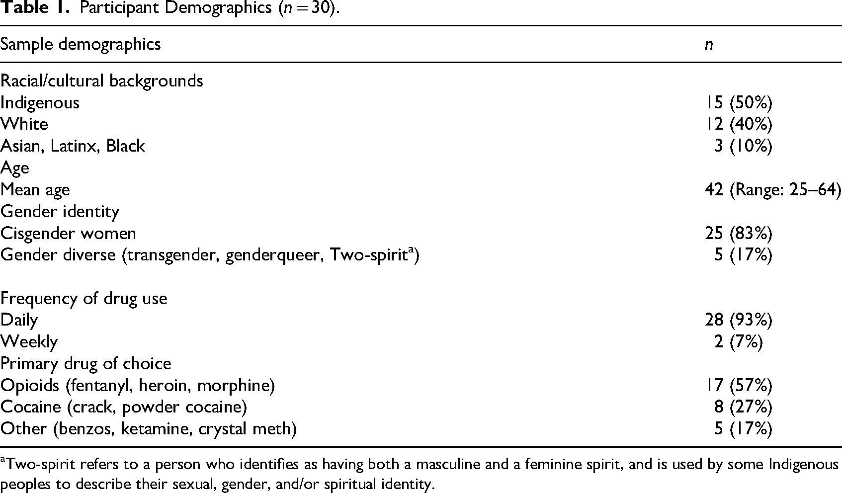 GBV refers to the harmful acts directed at a person or persons based on their gender identity, gender expression, or perceived gender, and can manifest as physical, sexual, emotional, and/or psychological violence (Walsh et al., 2015). Intersecting modes of economic and social marginalization, criminalization, racist, settler colonial logics, and drug war violence shape WWUDs’ experiences of GBV, with factors such as heightened surveillance and interactions with police—who are often also perpetrators of GBV—further increasing WWUDs′ exposure to GBV (Birgin et al., 2022; Boyd et al., 2018; Collins et al., 2020a; Collins et al., 2020b; Gilbert et al., 2015; Goldenberg, 2020; Harris et al., 2024; Knight et al., 2014; Ohtsuka et al., 2023; Shannon et al., 2008). Trans and two-spirit people face GBV at heightened rates due to the added layers of gendered discrimination and exclusion embedded within many facets of our societal fabric (Martin & Walia, 2019).