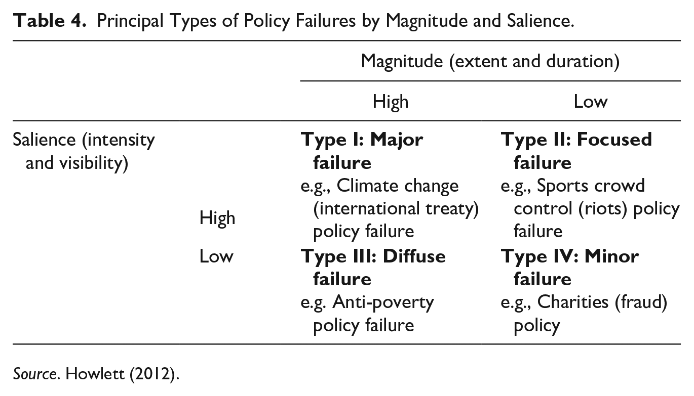 The central characteristics of any such failures are set out in Table 3 (Howlett, 2012). As the table shows, failures vary along several key dimensions, from extent to visibility, duration, and intensity but also in terms of intentionality or avoidability.