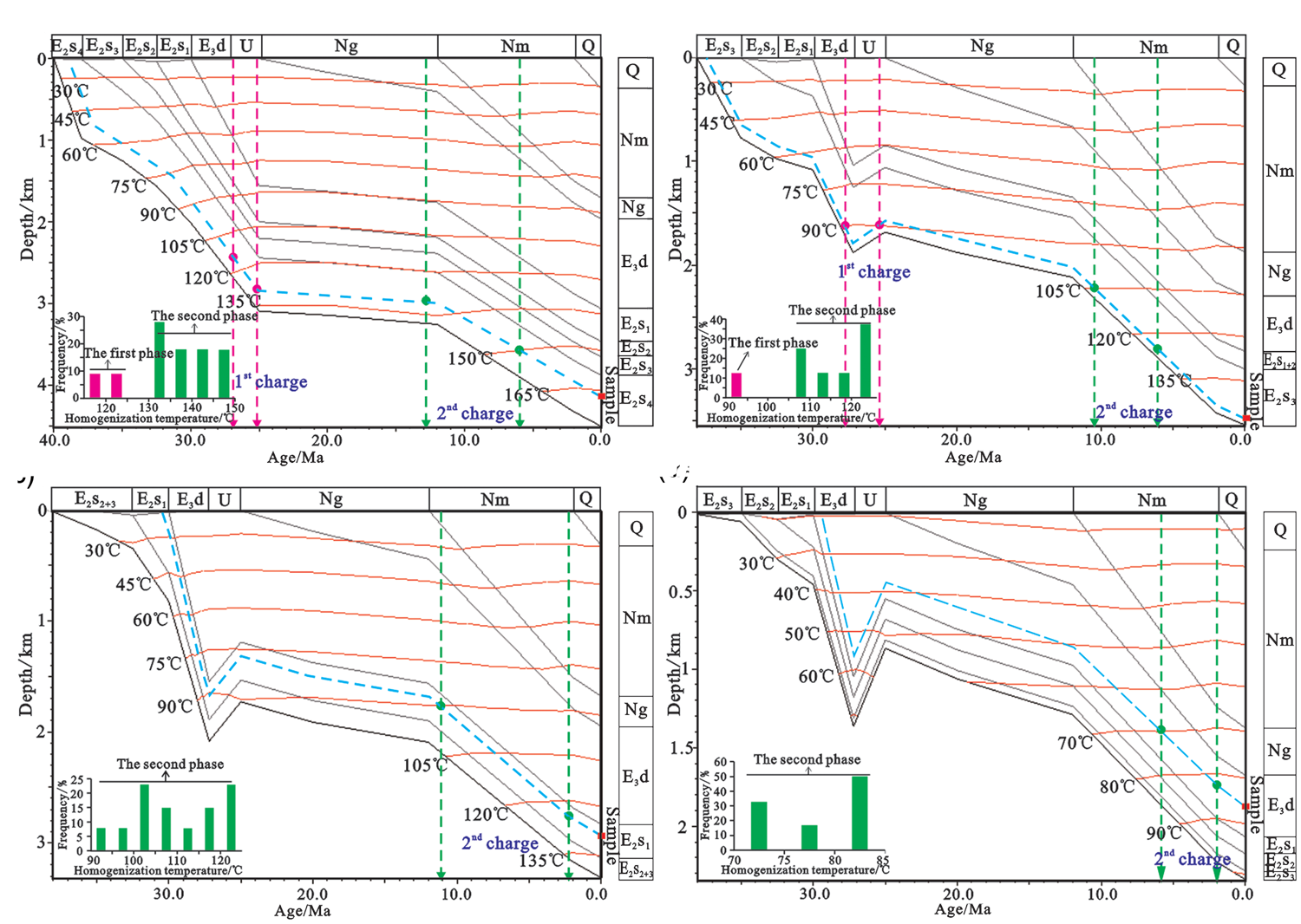 As shown in Figure 4 and Table 2, the time of the first phase of hydrocarbon filling is about 27.8–25.2 Ma (from late E3d to the late uplift stage), while the time of second phase is about 12–2 Ma (the deposition time of Nm Formation). Besides, the first phase of hydrocarbon filling occurred only in the area within or close to sag zones while the second phase occurred across the whole depression (Figure 5). What is more, there were two hydrocarbon filling periods in the deep E2s4 and E2s3 Formations, but there was only the second phase occurred in the shallow E3d and Ng Formations (Table 2), among which the Ng was deposited between the two periods of hydrocarbon charges. Because the number of hydrocarbon inclusions with the second filling phase is much larger than that with the first phase, it can be found that the second filling phase (the deposition time of Nm Formation) was the main pool-forming period.