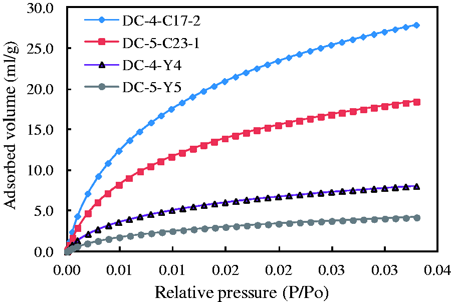 Both adsorption and desorption branches are usually recorded on the N2 physisorption experiment (Figure 5). The hysteresis loop is also observed in all shales, and partial coals (i.e. DC-4-C14-1, DC-5-C23-1, DC-5-C24-1, and DC-5-C25-1) and possibly results from capillary condensation in mesopores. According to the classification of IUPAC, the hysteresis patterns of all shale samples and coal samples (except for DC-5-C17-2 and DC-5-C24-1) fall into type H3 loop, which was aggregated by plate-like particles and given rise to slit-shaped pores (IUPAC, 1985). The hysteresis patterns of DC-5-C17-2 and DC-5-C24-1 samples remain nearly horizontal and parallel over a wide range of relative pressure (