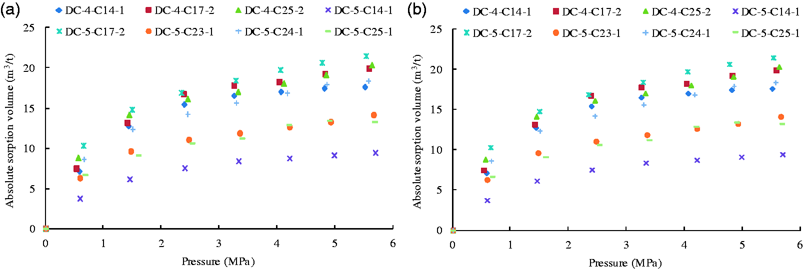 Methane storage capacities of coal and shale samples are characterized by methane isothermal adsorption, and the results are shown in Figure 9. Coal methane isothermal adsorption curves are drawn according to the Langmuir adsorption model and shale methane isothermal adsorption curves are fitted based on adapted Langmuir function. Langmuir adsorption model is expressed as