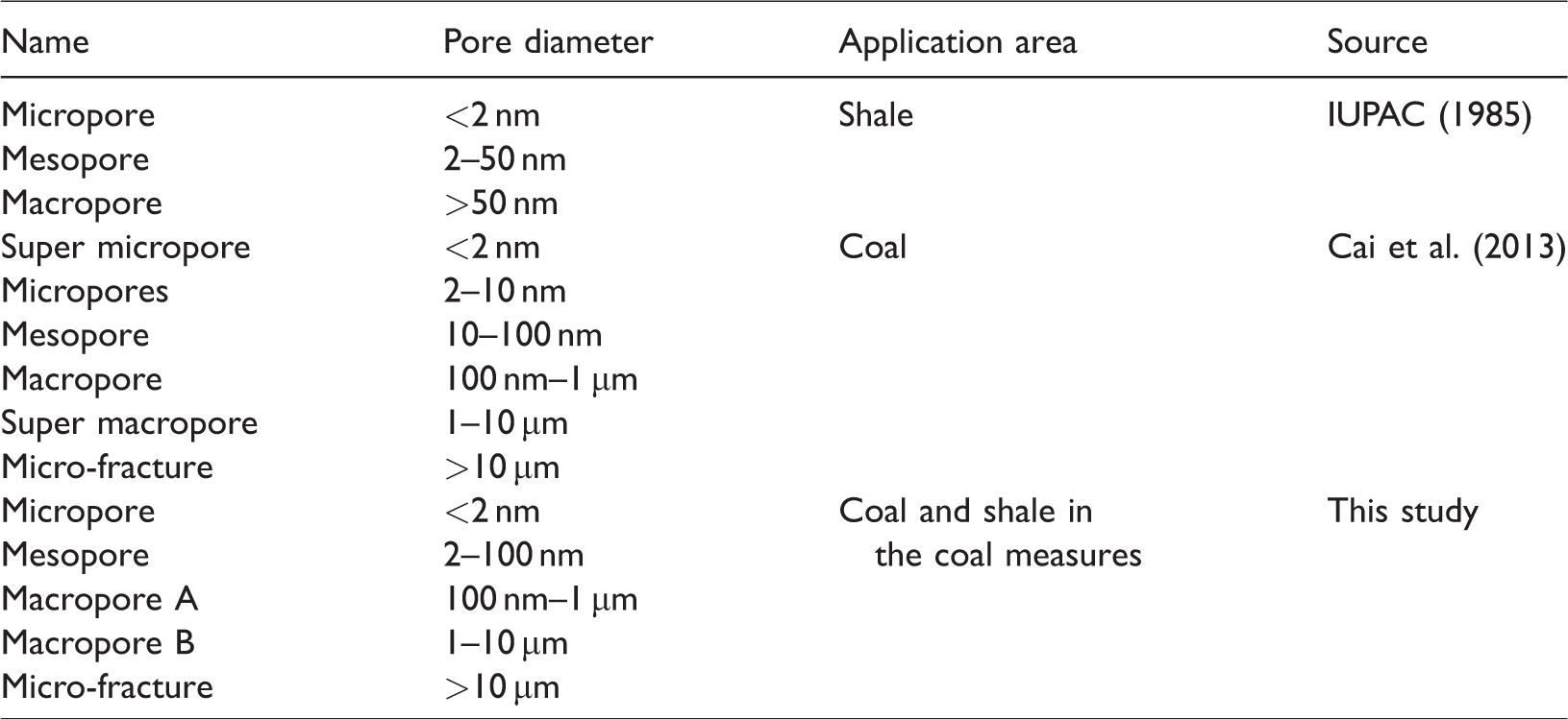 According to the classification of IUPAC, porous materials are divided into micropore (<2 nm), mesopore (2–50 nm), macropore (>50 nm) by their pore diameters. According to the classification of Yao et al. (2008) and Cai et al. (2013), micropores of coal are divided into <10 and 2–10 nm in diameter. Mesopore of coal is divided uniformly into a pore diameter range of 10–100 nm. First, there is no unified classification standard of pore structure for the coal and shale. Second, the pore sizes of 2–100 nm are not developed in the coal and shale reservoirs. For clearly calculating the contribution of coal and shale samples on its PV, an integrated PSD is reset in Table 2. They are divided into micropore (<2 nm), mesopore (2–100 nm), macropore A (100 nm–1 µm), macropore B (1–10 µm), and micro-fracture (>10 µm). The nomenclature of macropore A and macropore B is for avoiding ambiguity with the general usage of macropore (>50 nm) and megapore (>7500 nm).