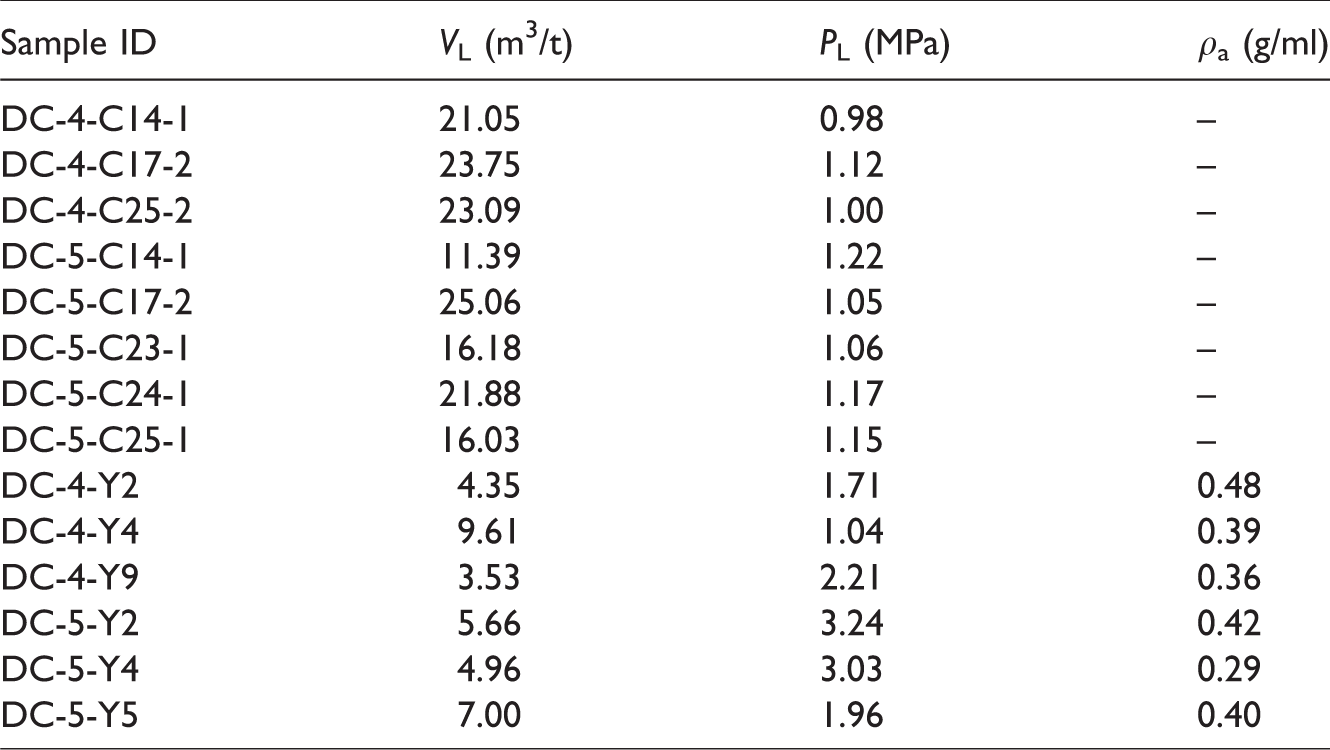 Previous research has demonstrated that maturity, mineral composition, and TOC content strongly affect the pore structure of the reservoir (Wang et al., 2014; Zhao et al., 2018). On the basis of XRD and Rock-Eval pyrolysis analysis, the mineral composition, maturity, and TOC content results are shown in Table 1. For the coal samples, the clay mineral composition is mainly mixed I/S. The principal clay mineral composition of shale samples is kaolinite. For the three coal samples from well DC-4, the maturity and TOC content means the content is 3.02% and 78.9 wt%. Brittle minerals mean content—including quartz and calcite—is 25.8 wt%. For the three shale samples from well DC-4, the mean contents of maturity, TOC, and brittle minerals are 2.91%, 8.3 wt%, and 50.9 wt%. For the five coal samples of well DC-5, the mean contents of maturity, TOC, and brittle minerals are 3.07%, 60.7 wt%, and 24.0 wt%. For the three shale samples of well DC-5, the mean contents of maturity, TOC, and brittle minerals are 3.09%, 4.6 wt%, and 34.5 wt%. Comparing the above results, it shows that the maturity of coal and shale samples in well DC-4 is lower than those of well DC-5; however, brittle minerals and TOC contents of coal and shale samples in well DC-4 are higher than those of well DC-5.