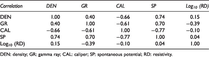DEN: density; GR: gamma ray; CAL: caliper; SP: spontaneous potential; RD: resistivity.