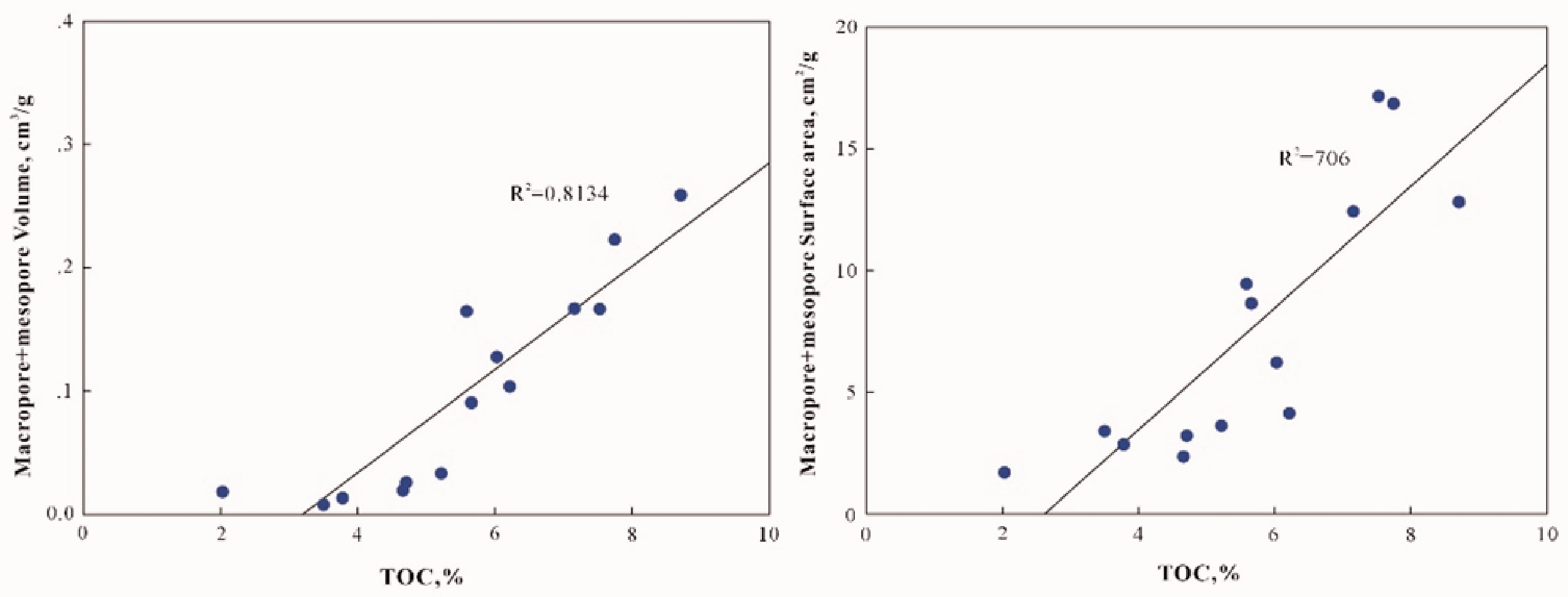 The correlation between the TOC contents and meso-pores and macro-pores.
