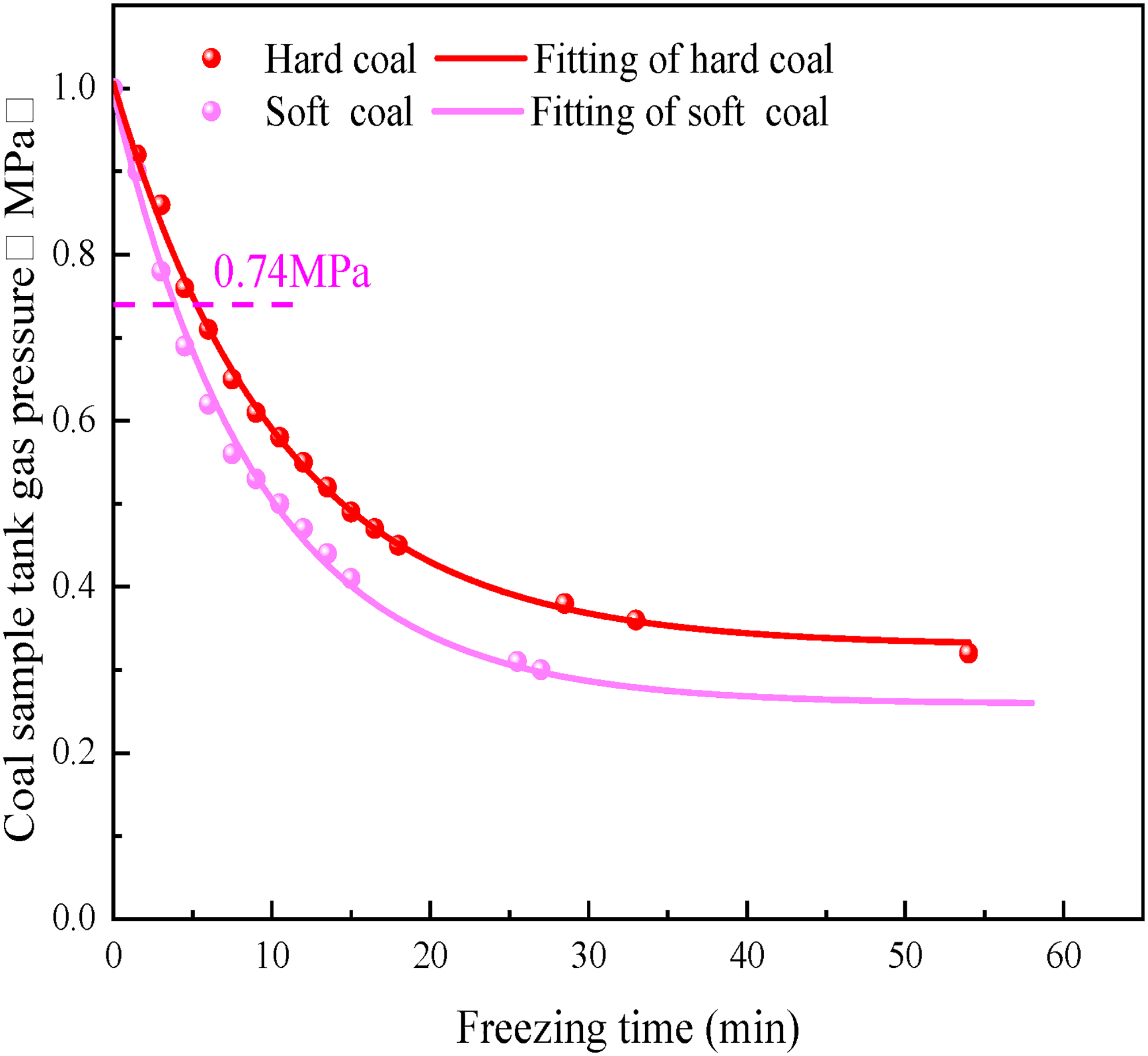 For the gas-containing coal sample at the same freezing temperature (-20 °C) and adsorption equilibrium pressure (1.0 MPa), the gas pressure of different coal types (soft and hard coal) in the coal sample tank changed as a monotonously decreasing function. The gas pressure of the coal sample tank is proportional to the freezing time as a power function relationship, and its expression is given by Equation (1); all degrees of fit are above 0.99. The relevant fitting parameters are listed in Table 4.
