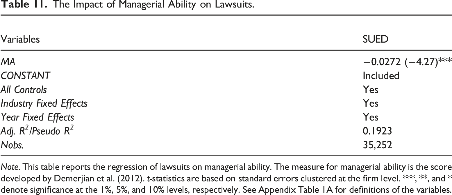 Finally, our analysis adds to the literature on factors that influence the likelihood of a lawsuit. According to prior research, such a likelihood is substantially affected by disclosure, social capital, and political corruption (Jha & Chen, 2015; Jha et al., 2021). Extending this stream of research, our distinct evidence demonstrates a lower litigation risk for firms managed by more able managers. Clearly, a firm’s managerial ability influences not only audit outcomes but associated risk as well.