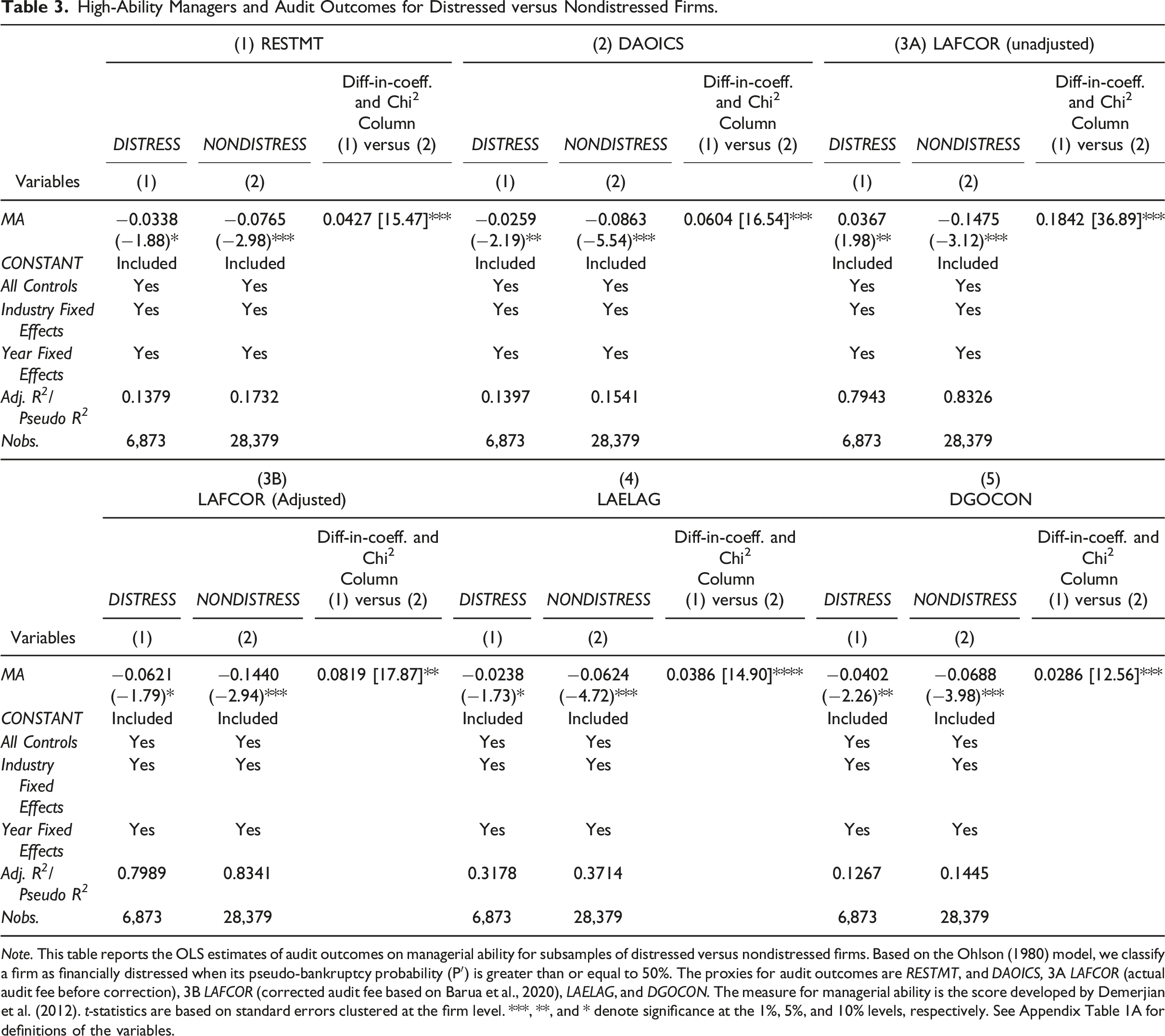 High-Ability Managers and Audit Outcomes for Distressed versus Nondistressed Firms.