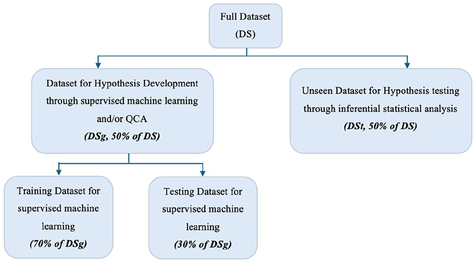 Third, when employing supervised ML at Stage I of the MSMMF, DSg should be further split into a training and testing dataset as per best practice in ML. The sequential splits are visually represented in Figure 4.