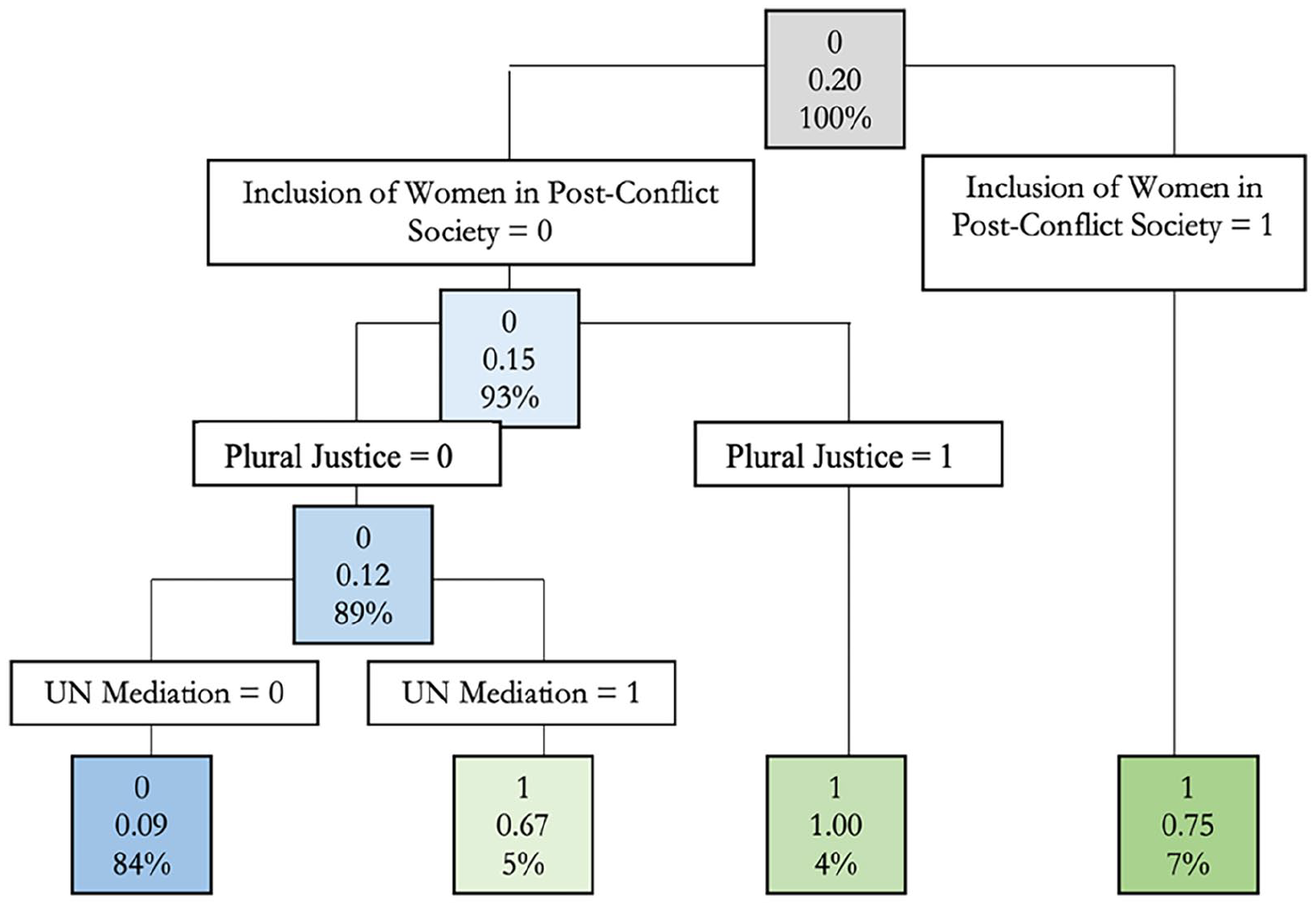 In our case, CART identified UN leadership, and peace agreement provisions for the inclusion of women in post-conflict societies and for plural justice mechanisms as accurately predicting non-recurrence of civil war in the training dataset. These three factors also had a high predictive accuracy when employed to predict non-recurrence in the testing dataset. Based on supervised ML, we therefore identified three possible explanatory variables which appeared associated with the end of civil war in peace processes that experienced prior conflict recurrence: UN leadership of the mediation process; provisions to include women in post-conflict societies; and provisions for plural justice (visually represented in Figure 6).