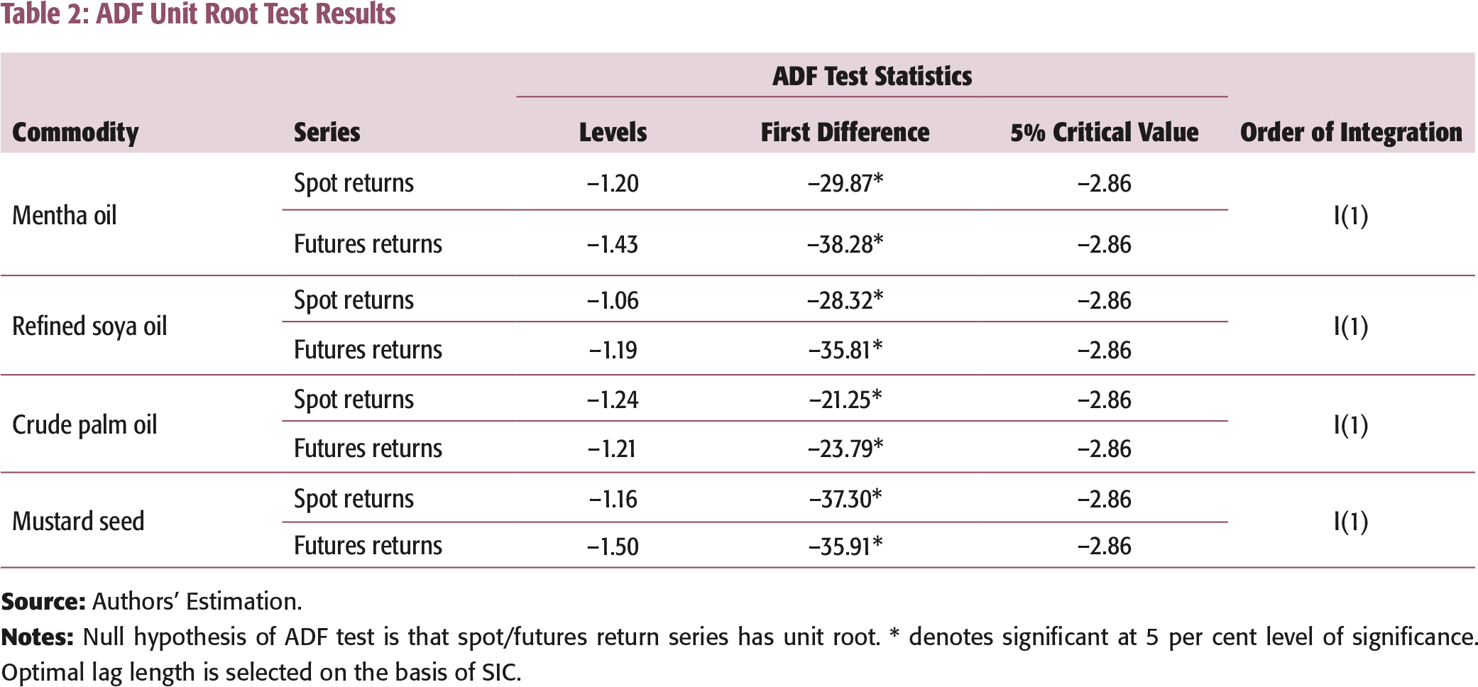 If the variables being examined are stationary, that is, their mean and variance are constant over time, the regression analysis done would provide time invariant and efficient estimates. However, most of the macro economic and financial time series data exhibit random walks and are found to be non-stationary. Regression analysis done with non-stationary variables leads to spurious results which might produce misleading inferences about the degree of association between the variables and the estimated parameters. If two-time series are non-stationary in levels but their first differences are stationary, they are said to be integrated of order one and denoted as I(1). The spot and futures log price series of each commodity are first subject to Augmented Dickey–Fuller (ADF) test (Dickey & Fuller, 1979) to determine whether they are I(1). The test checks for the presence of unit root and if detected, the log prices are differenced to remove unit root and make them stationary. This gives spot and futures return series.
