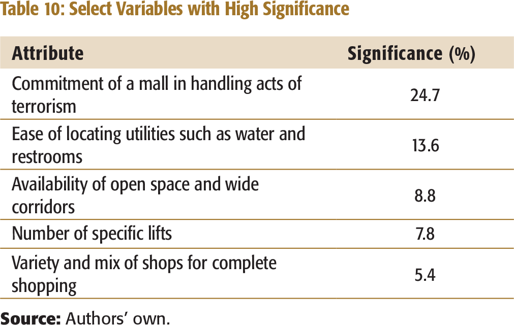 A closer look at the variable-wise scores indicate that examining these results further at the level of individual attributes, one observes that overall importance of attributes ranges between 24.7 per cent (commitment of a mall in handling acts of terrorism) to 1 per cent (strength of railings and other infrastructural facilities). Interestingly, both the attributes converge into a single factor named ‘safety and security’. It means that shoppers are indeed concerned about safety and security inside the malls, but all the sources of threat/danger are not equally critical. Hence, mall management must understand the relevant apprehensions and act accordingly to encourage shoppers to visit malls. Since managing a single aspect like ‘handling acts of terror’ shall take care of one-fourth of total impact on loyalty, it is pertinent for mall developers to provide requisite measures against acts of terrorism.