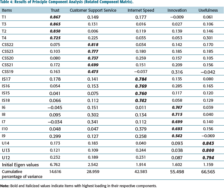 Table 4 depicts item loadings, Eigen value and cumulative percentage of variance explained by the five components. Based on the Eigen value criteria, five components were obtained after the rotation of the dataset as depicted in Table 4. The cumulative percentage of the variance of all the five components was found to be 66.56%, which was above the threshold limit of 50% (Table 4). The items with loading above 0.60 were retained in their respective components (Hair et al., 2003). It took about 10–20 iterations to clean the whole dataset based on criteria set earlier. The rotated component matrix is shown in Table 4. Through data reduction, two items have been removed from the dataset containing 21 items. In Trust, all four items were retained and out of five items of customer support service, four were retained with the deletion of CSS19. In internet speed, all the four items were retained; however, in innovation, three items were retained with the deletion of I9. In usefulness, all the three items were retained. Hence, out of 21 items, 19 were retained and two items were dropped.