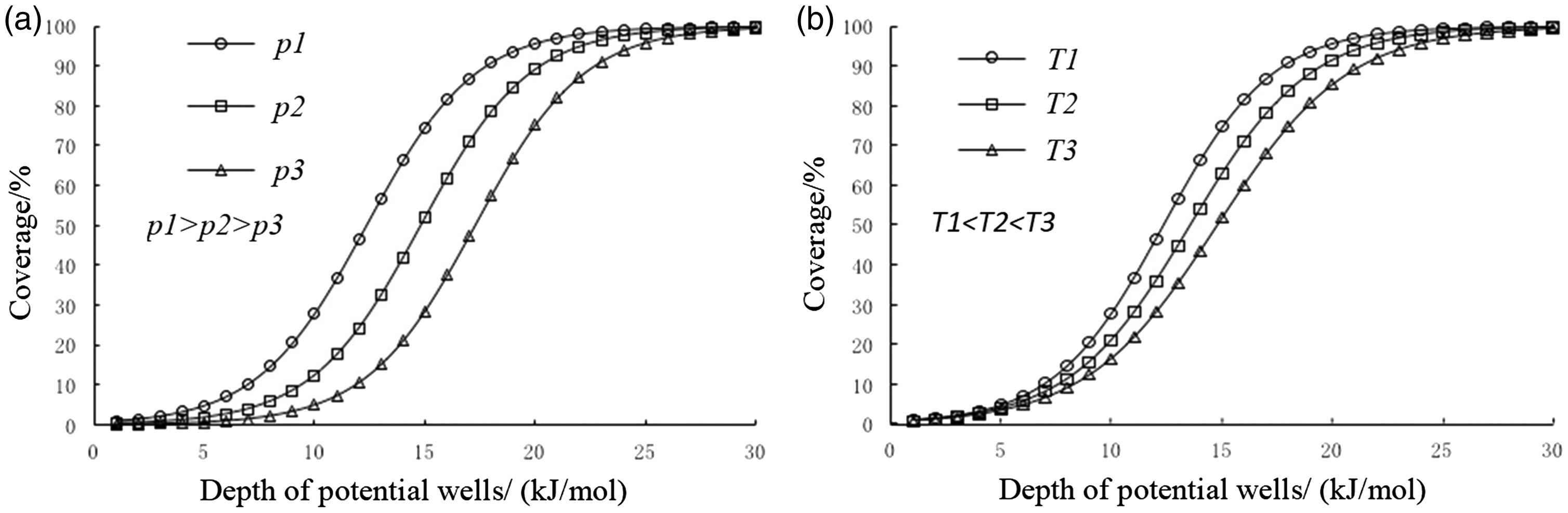 Coverage rate of (a) isothermal and (b) isobaric adsorption at different potential well depths.