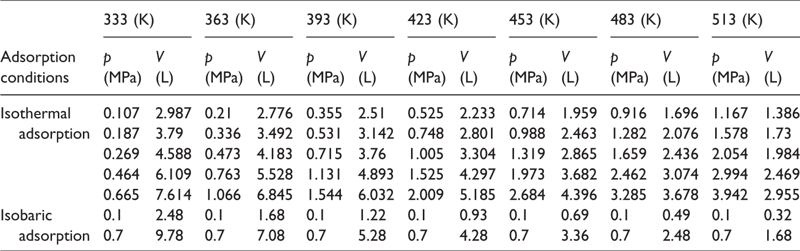 The adsorption amount, temperature and adsorption pressure of the isothermal and isobaric adsorption experiments are displayed in Table 1. Firstly, the isothermal adsorption process at different temperatures was analysed. The curve fitting of the isothermal experiment data is displayed in Table 2, based on the Langmuir formula (equation (4)). It is indicated that, in the temperature range from 333 to 513 K, the lean coal adsorption capacity during isothermal methane adsorption increased with an increasing adsorption pressure, and the increasing rate slowed. The adsorption curve is similar to the Langmuir curve. The parameter