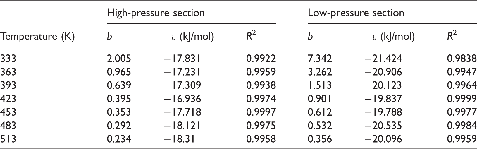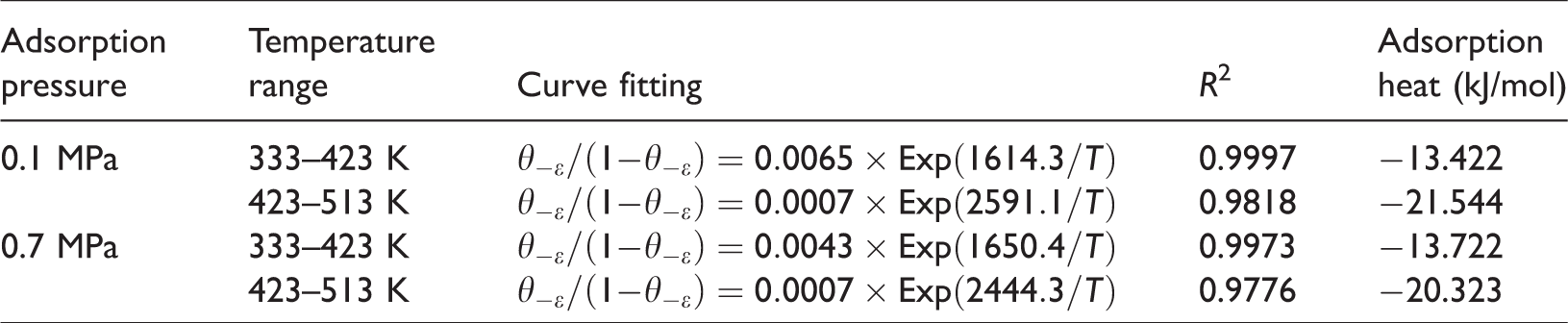 The influence of temperature on adsorption heat can be analysed by curve fitting in stages during the isobaric adsorption experiment. As illustrated in Figure 5, the temperature section of the 333 to 423 K was regard as the low-temperature stage of the isobaric adsorption experiment. Conversely, the temperature section of 523 to 513 K was regarded as the high-temperature stage of the isobaric adsorption experiment. From equation (2)