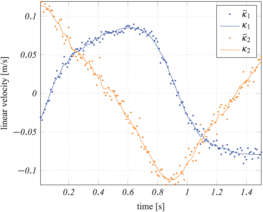 We have reproduced conditions outlined in Armesto et al. (2017a) to simulate a kinematic seven-degrees-of-freedom Kuka LBR IIWA R800 robot. We have generated a circular wiping motion together with a joint limit avoidance policy affecting the first, third, and seventh joints of the robot, as described in Armesto et al. (2017a). Both these ground-truth policies have an influence on the motion in the null space of the primary task that aligns the tool with the wiping of a planar surface. A single trajectory of a wiping motion with a duration of 1.5 s sampled at 0.01 s intervals has been collected with a randomly oriented planar surface placed to be perpendicular to the tool of the robot. The robot’s end effector is therefore initially aligned with the surface and in contact with the surface. This ensures that alignment errors are initially close to zero. We can therefore use the singular-value decomposition approach to estimate the constraint parameters. During the data generation, we have artificially added Gaussian noise with a standard deviation of 5% of the joint’s physical range on each joint’s velocity, to emulate collection of noisy (non-perfect) data from a human operator.